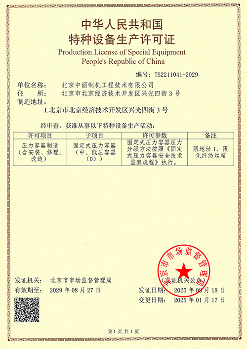 近日,北京中丽压力容器制造及设计许可证复证工作顺利通过中国特种设备检测研究院3位专家组成的评审组的评审,再次取得了压力容器的《中华人民共和国特种设备生产许可证》,本次许可证二证合一,有效期四年。